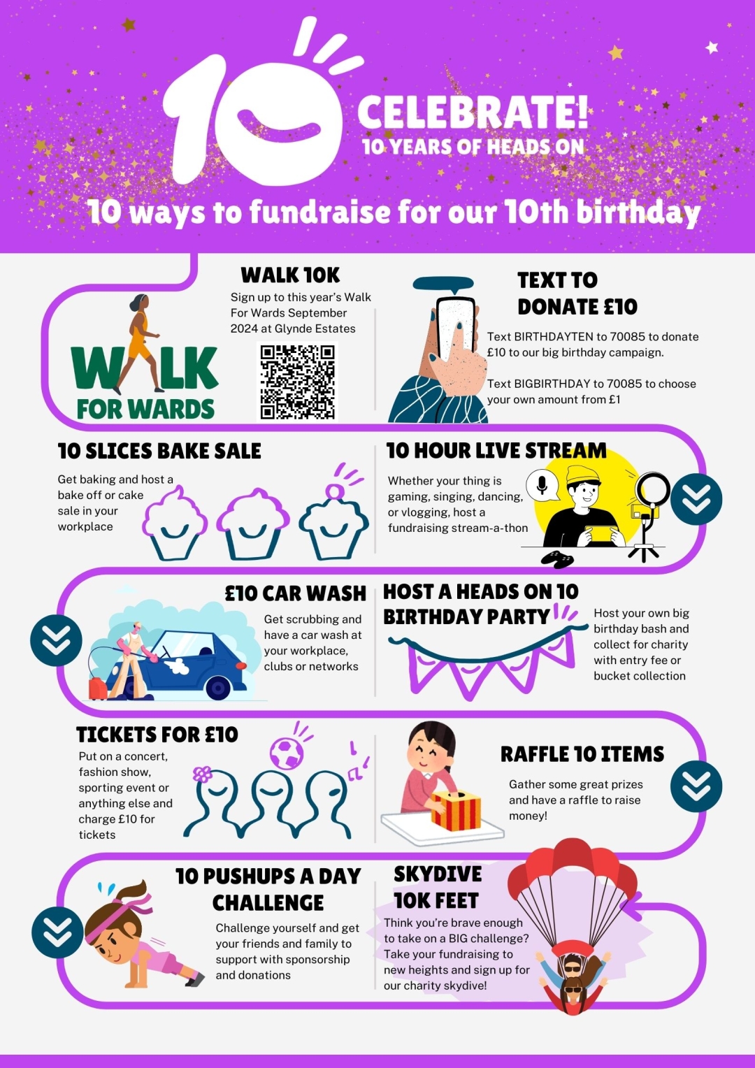 Whether you're hosting a party, running a bake sale, or taking part in our signature event Walk for Wards, every contribution helps support our vital work. Let's come together to celebrate a decade of impact and ensure many more years of making a difference. Follow HeadsOnCharity on Facebook or Instagram to find out more about how you can be a part of our special anniversary campaign!